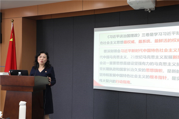 李恺首先从纵向和横向两个维度,对《习近平谈治国理政》三卷章节进行了比较,随后从“出版的历史背景与重大意义”“总体框架和主要特色”“第三卷的几个重大论断”三个方面,对第三卷进行了详细分析。她谈到,《习近平谈治国理政》是学习习近平新时代中国特色社会主义思想的权威教材,第三卷进一步呈现了新时代坚持和发展中国特色社会主义的一系列具有原创性、时代性、指导性的重大思想观点。希望全体党员师生把《习近平谈治国理政》第三卷与第一卷、第二卷作为一个整体,坚持全面系统学、深入思考学、联系实际学,深入领会习近平新时代中国特色社会主义思想的重大意义、科学体系、精神实质和实践要求,深刻体悟这一思想彰显的人民情怀、自觉自信和科学方法,切实做到学、思、用贯通和知、信、行统一。