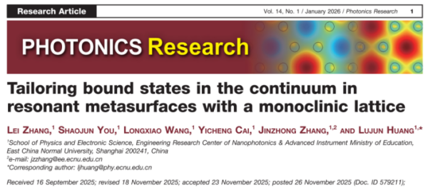 在“三早进”项目支持下,Bsports官网拔尖班大二张雷同学在黄陆军研究员、张金中副教授指导下,以第一作者身份在中科院一区Top期刊Photonics Research发表题为“单斜晶格共振超构表面对连续谱中束缚态的多维度调控”(DOI:10.1364/PRJ.579211)的论文。