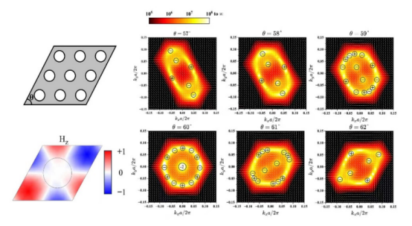 多维度光场调控是当前国际纳米光子学领域的研究热点。连续谱中的束缚态(BICs)凭借其超高品质(Q)因子和优异的光场局域能力,在增强光-物质相互作用以及开发高性能光子器件等领域具有重要应用前景。然而,目前绝大多数研究主要集中于六角晶格或方形晶格的超构表面,而单斜晶格超构表面中BICs的演化规律尚未研究。张雷同学通过研究发现,单斜晶格超构表面能为光场(Q因子和偏振)调控带来全新的自由度。他经过计算发现,单斜晶格的夹角θ和边长比k(b/a)对动态调控动量空间中的BICs发挥了关键作用。通过改变单斜晶格的夹角θ或者边长比k,可以实现对称性保护BICs的劈裂和偶然性BICs的合并。此外,数值仿真表面通过协同调控晶格夹角、超表面厚度、空气孔形状及旋转角度,可实现多个BICs在任意非高对称点的合并。张雷同学进一步研究发现,通过把圆孔换成三角形孔打破C2v对称性将BICs分裂成多个携带半荷的圆偏振态, 可以实现圆偏振点在动量空间的旋转。张雷同学的工作首次系统探究了单斜晶格超构表面的新型BICs调控机制,揭示了晶格夹角、尺寸比等参数对动量空间中BICs的调控规律,为新型高性能光子器件设计提供了全新思路。