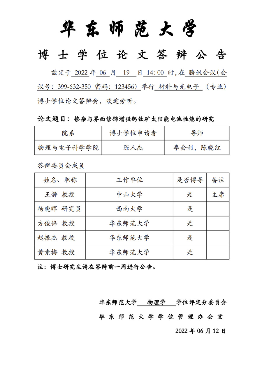 Bsports必一体育 博士学位论文答辩公告-陈人杰