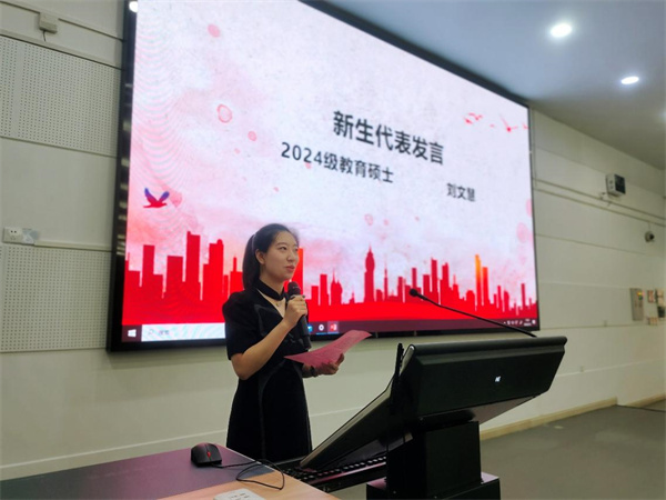 2024级教育硕士刘文慧作为新生代表发言,她以河流的幸福比喻新的求学旅程。她表示,研读教育硕士,提升育人能力,惠泽更多学生,感受河流滋润万物的幸福;与昔日同窗再续学缘,共同成长,感受河流遇见另一条河流的幸福;筑牢教育理想,与国家和民族产生更深的联结,感受河流奔涌入海的幸福。