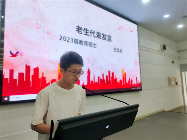 2023级教育硕士王兵兵作为老生代表发言,他表示,“风雨兼程,未来才有无限可能;乘风破浪,才不至于随波逐流”,希望新同学调整心态,正确看待非全日制学习,享受坚持的过程;合理规划,在教育实践中探索,为提升教学水平蓄能储智;矢志创新,以热爱传递热爱,全情投入学习研究。