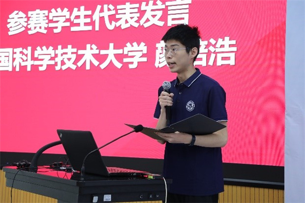 开幕式最后,来自中国科学技术大学的颜培浩同学和来自华东理工大学的钟菊花教授分别作为参赛学生代表和裁判代表作表态发言。