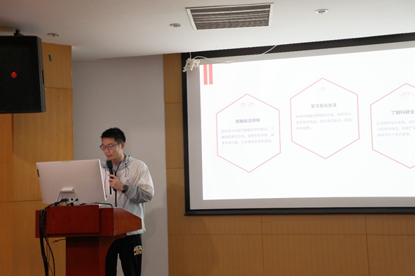 孙钰雯分享了参与CUPT竞赛的经历。她讲道,通过解决贴近生活的赛题,她掌握了Matlab、Origin等科研软件,提升了实验设计与理论分析能力。她鼓励同学们进入科研团队后,尽早争取独立课题、发表论文,从“助手”成长为“主导者”。