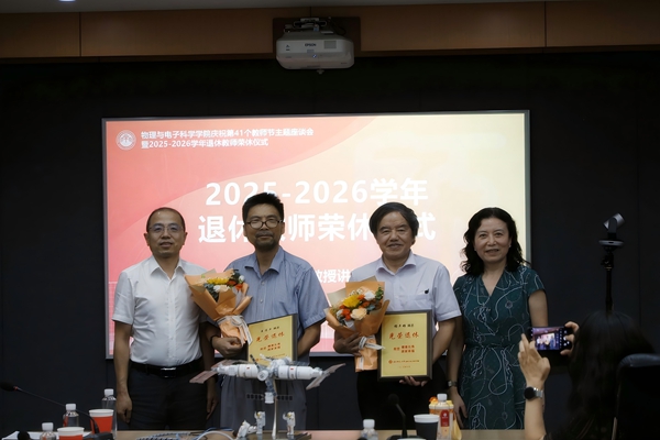 为弘扬尊师重教的传统,学院为2025-2026学年退休教师举办了荣休仪式,以此表达对荣休教师的致意和感谢。学院党委书记李恺和工会主席赵振杰一同向杨平雄、王连卫两位老师送上了纪念牌和鲜花,感谢他们多年来为学院付出的努力和贡献。